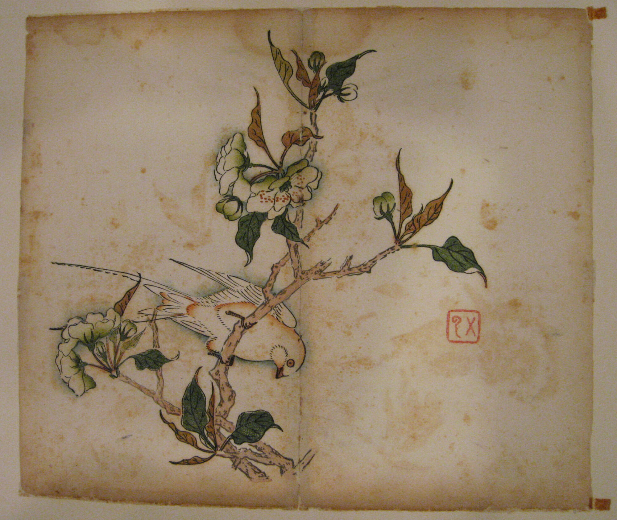 Gallery LabelThese prints, all illustrated by one of the manual's artists, Ling Yunhan, reveal diverse techniques and styles, including ink monochrome; fine line and colors; and boneless (motif without outline). Color and ink in subtle gradations were precisely printed in the minute spaces inside the images of feathers, leaves and petals.