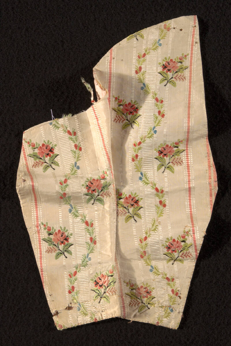 DescriptionCream striped silk with supplementary weft of siler strip in the narrow stripes. Brocaded with silver strip and with painted polychrome flowers.