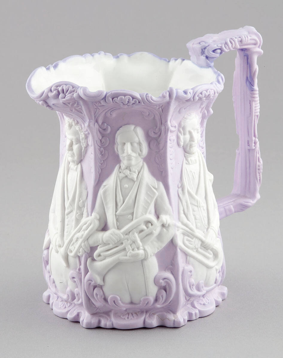 DescriptionWhite body, inside glazed, outside smear-glaze. Molded in panels of "The Distin Family--The Saxw Horn Performers", five panels each being a portrait in white relief of a member of the family with instrument in hand; background lavender