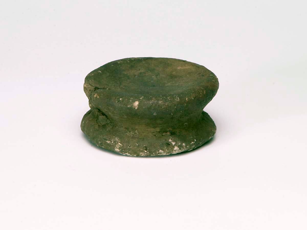 DescriptionUnglazed, three-piece pottery vessel consisting of a large, nearly spherical bottom section, with two male, two female, and four froglike figures modeled in high relief around the perimeter. Surmounting this section is a second section acting as a stopper in the form of a human head with prominent nose, incised eyes, and plaited hair. This section has a small disk stopper.ProvenanceLarry W. Welling, Kansas City, MO, by 1981 [1];