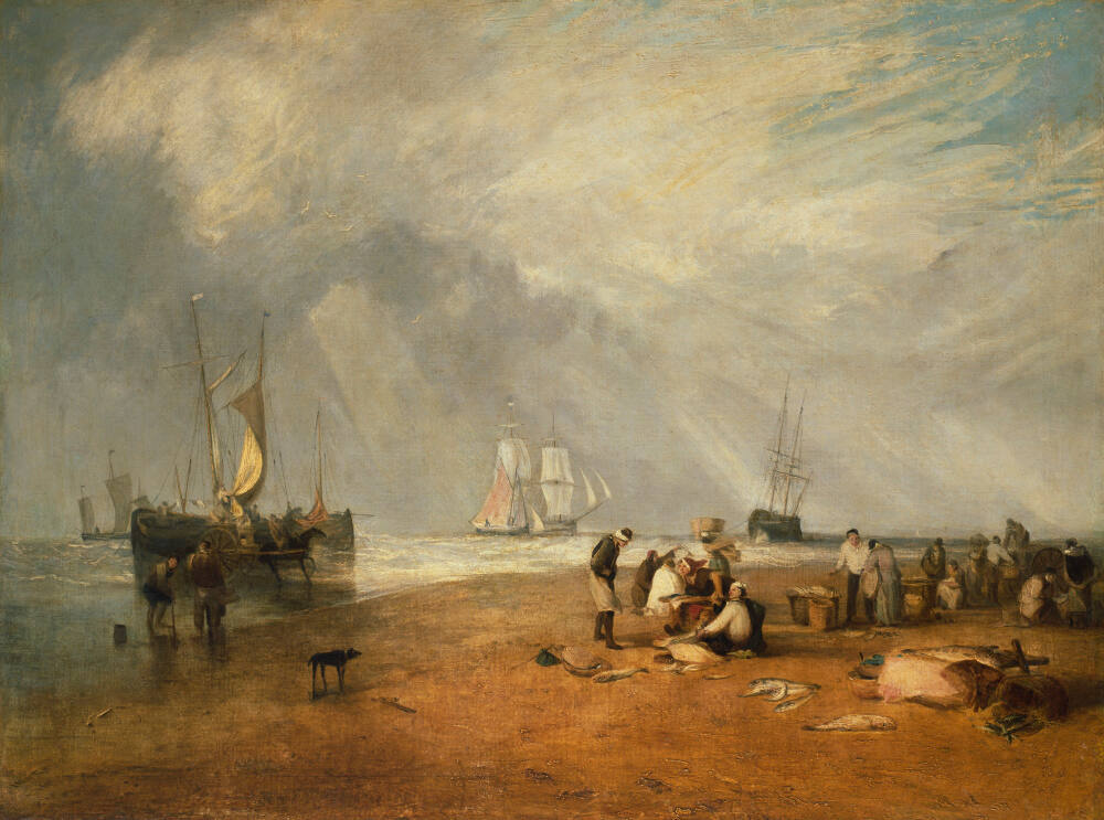 Illuminated by sunbeams, fishermen in this idealized scene spread their catch for sale on a beach in Hastings, England. In reality, Hastings was rapidly expanding as both a fashionable seaside resort and fishing town. Its growth created tension between developers and fishermen—friction that J. M. W. Turner masked here.
