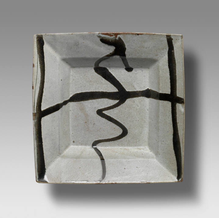 DescriptionHeavily potted grey stoneware body, moulded to a square shape with pronounced central depression surrounded by a heavy, everted flat lip; interior, exterior, and base covered with irregular, thick greenish-grey glaze; interior decorated with irregular lines of thick greenish-brown glaze poured on rapidly from a ladle.Gallery Label