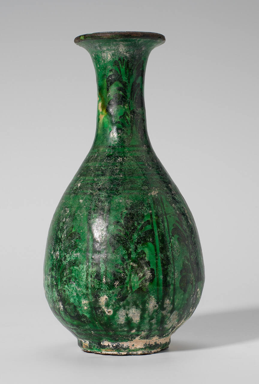 DescriptionWine bottle with a pale yellow glaze, round body with a long narrow neck that has a wide lip near the top, then another small spout at the top. Also has a small pouring spout attached to the body.