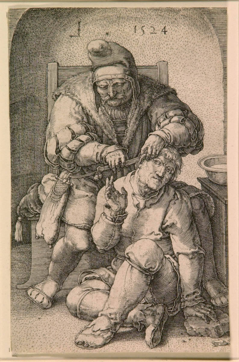 Gallery LabelAt first glance, this engraving appears to be a straightforward representation of a patient undergoing a surgical procedure. Various details, however, signal that this scene contains a satirical and moralizing message. The surgeon’s fur-lined robe and heavy purse identify him as a quack focused on financial gain. In contrast, the victim sitting at the surgeon’s feet wears tattered clothing, indicating that he has little money to spare.