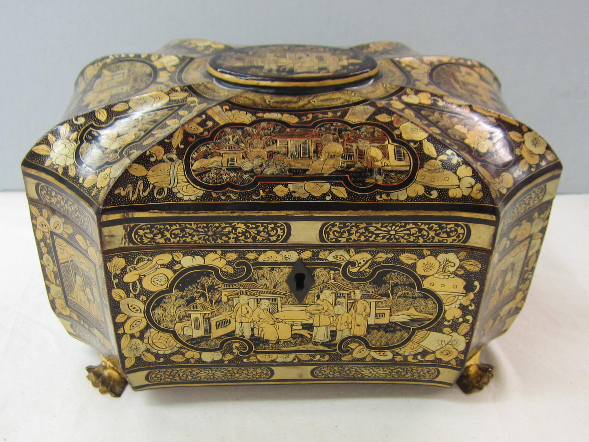 DescriptionLacquer caddy with two lidded pewter containers inside.