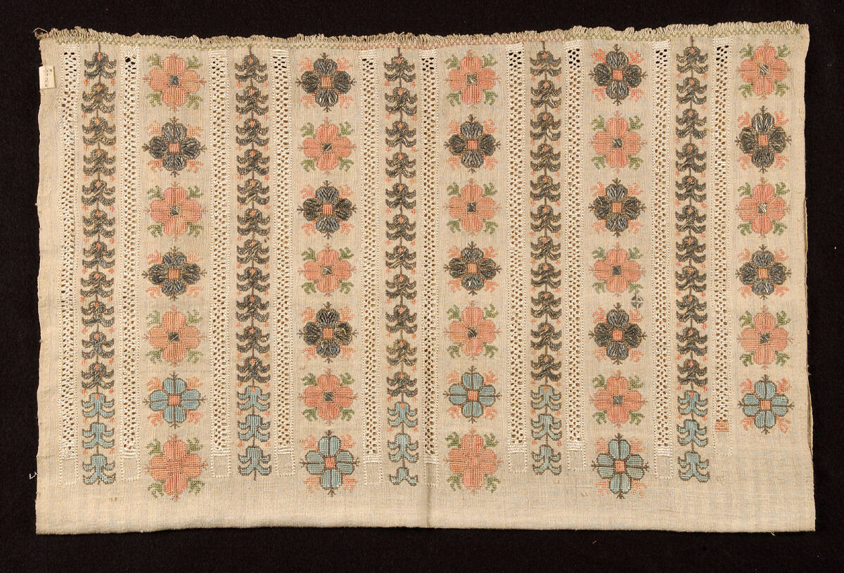 DescriptionAlternating rows of roses, open-work, and tall leafy plants. Salmon, green and silver threads.