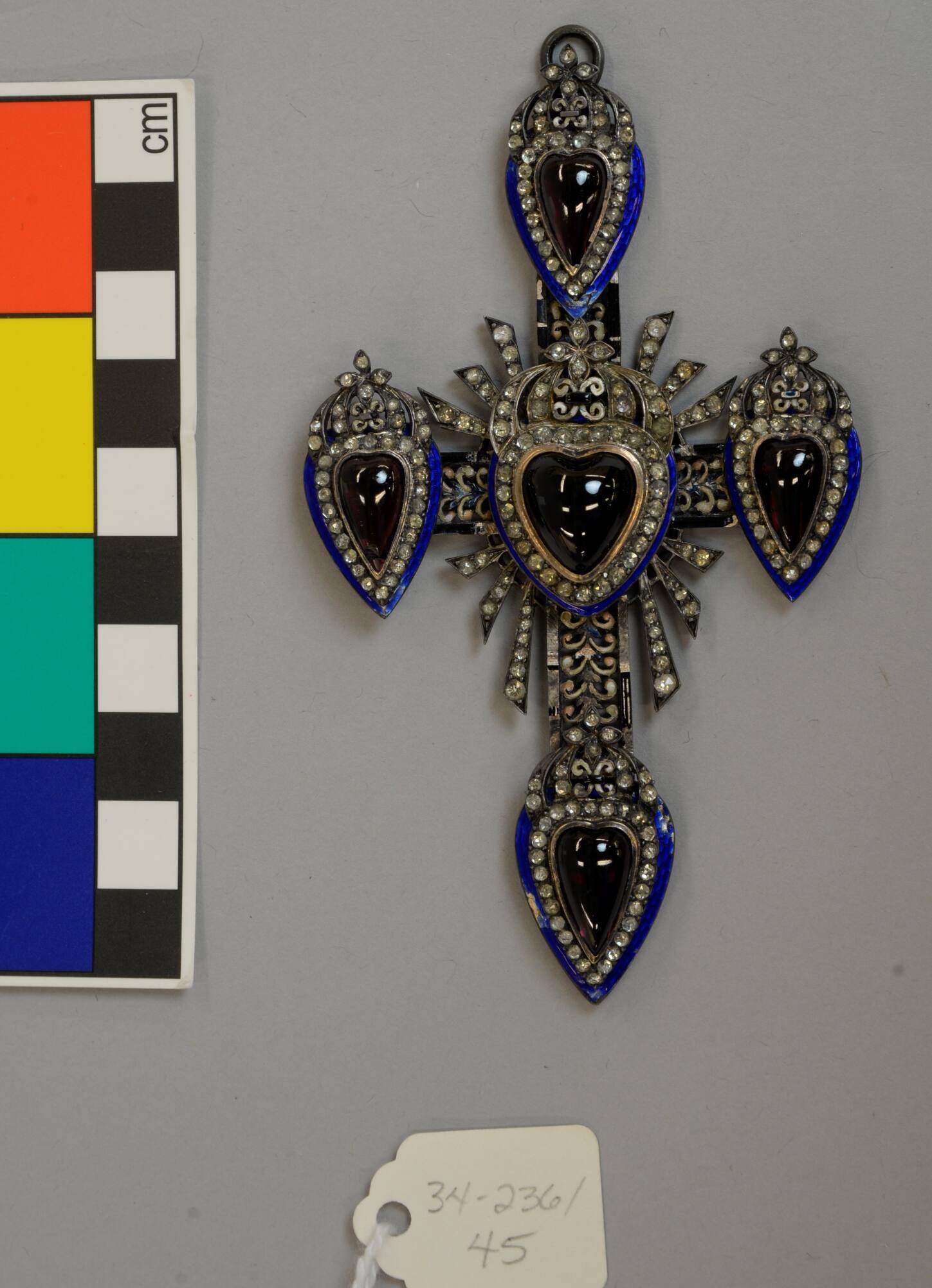 DescriptionElaborate silver cross set wih five heart-shaped rubies, each with border of diamonds and outer border of blue enamel.ProvenanceElla Clark Loose (Mrs. Jacob L. Loose, 1860-1945), Kansas City, MO and Washington, DC, by 1934 [1];