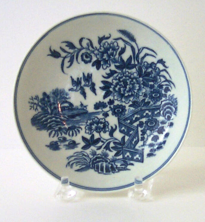 DescriptionCylindrical cup with handle, 2 blue stripes around outside top edge, scene on outside depicting an island, flowers, plants, birds and a fence. Saucer with two blue stripes around inside rim and same scene as on cup.
