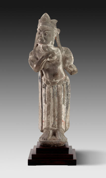DescriptionSmall guardian type of figure, headdress and draped lower body. Right hand clenched in front of chest.Exhibition HistoryFar Eastern Art Exhibit, US Army Training Center, Fort Leonard Wood, MO, May 1968.