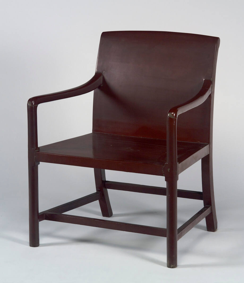 DescriptionWood armchair of a very plain design, with a wide seat, and lacquered a deep red.