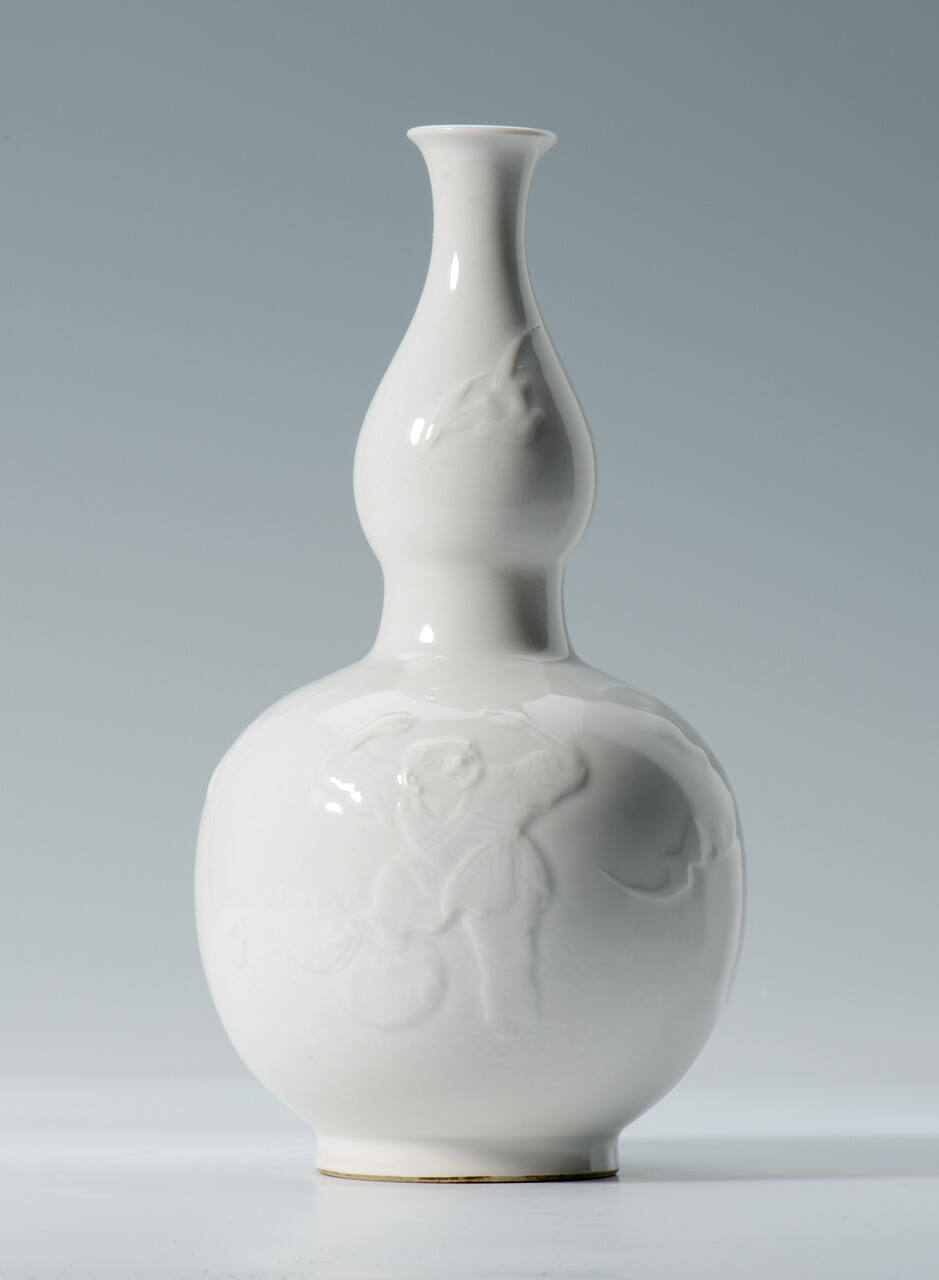 DescriptionWhite porcelain gourd-shaped bottle with a design of a boy, or "karako," and bats in relief. With a teakwood stand.