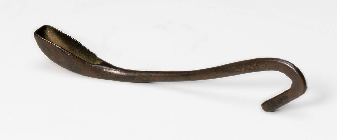 DescriptionBowl with straight sides (in form of a scoop), curved handle with loop.