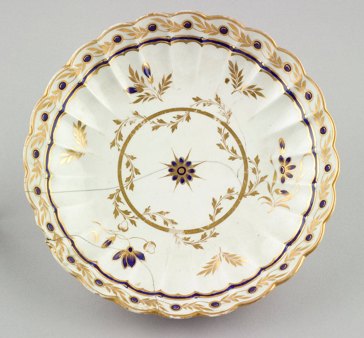 DescriptionPlate of white porcelain decorated on inside with single flower and leaf designs in gold and blue, and continuous leaf pattern border around edge. Gold and blue circular leaf design in center. Fluted sides.ProvenanceMargaret Cameron Chapman (née Mann, 1865-1935), Kansas City, MO, by 1935;