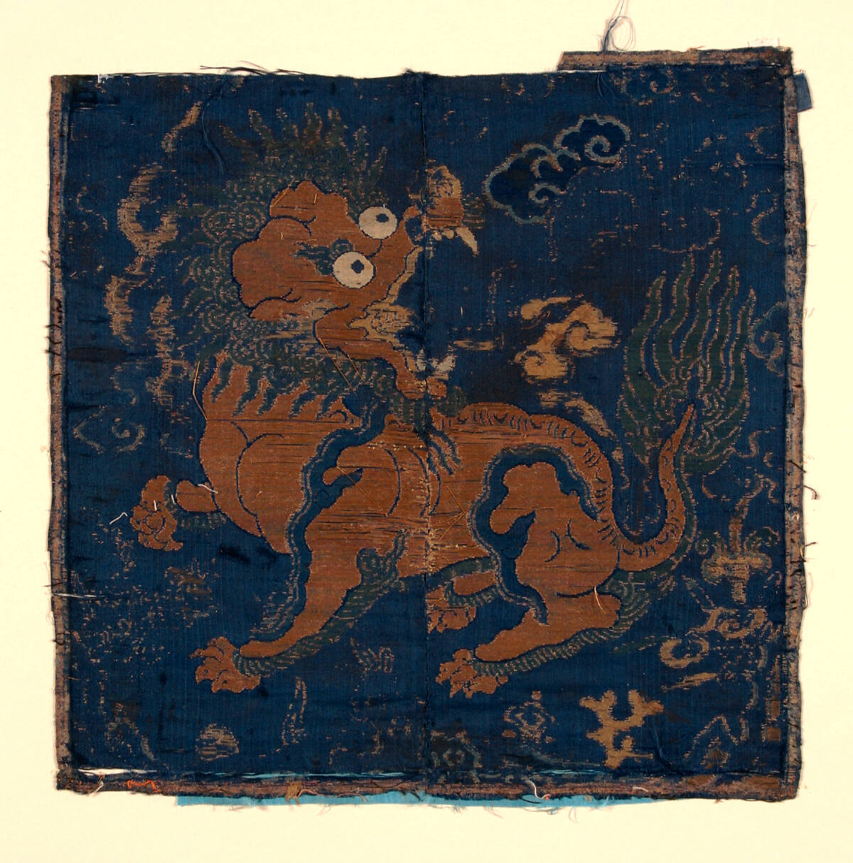 DescriptionDark blue satin brocaded in gold, blue, green, and tan. Design of lion with right forepaw raised. Military official's insignia.