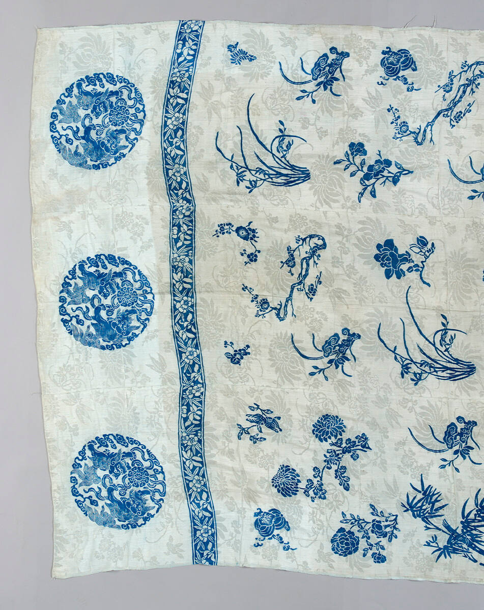 DescriptionLight blue damask crepe stencil design in dark blue of various flowers and fruit. Border at top. Three medallions with Fu dogs.