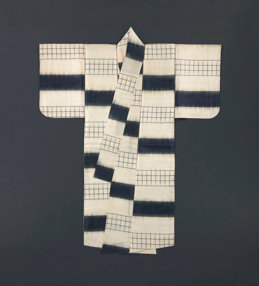 DescriptionBlue ground silk with ikat (kasuri) weave and gold leaf. No robe (Surihaku type) with seaweed and shell (mirugai) pattern.Exhibition HistoryMasterpieces of Japanese Art, Dallas Museum, Dallas, TX, Oct.4-Nov.30, 1969, no. 50.