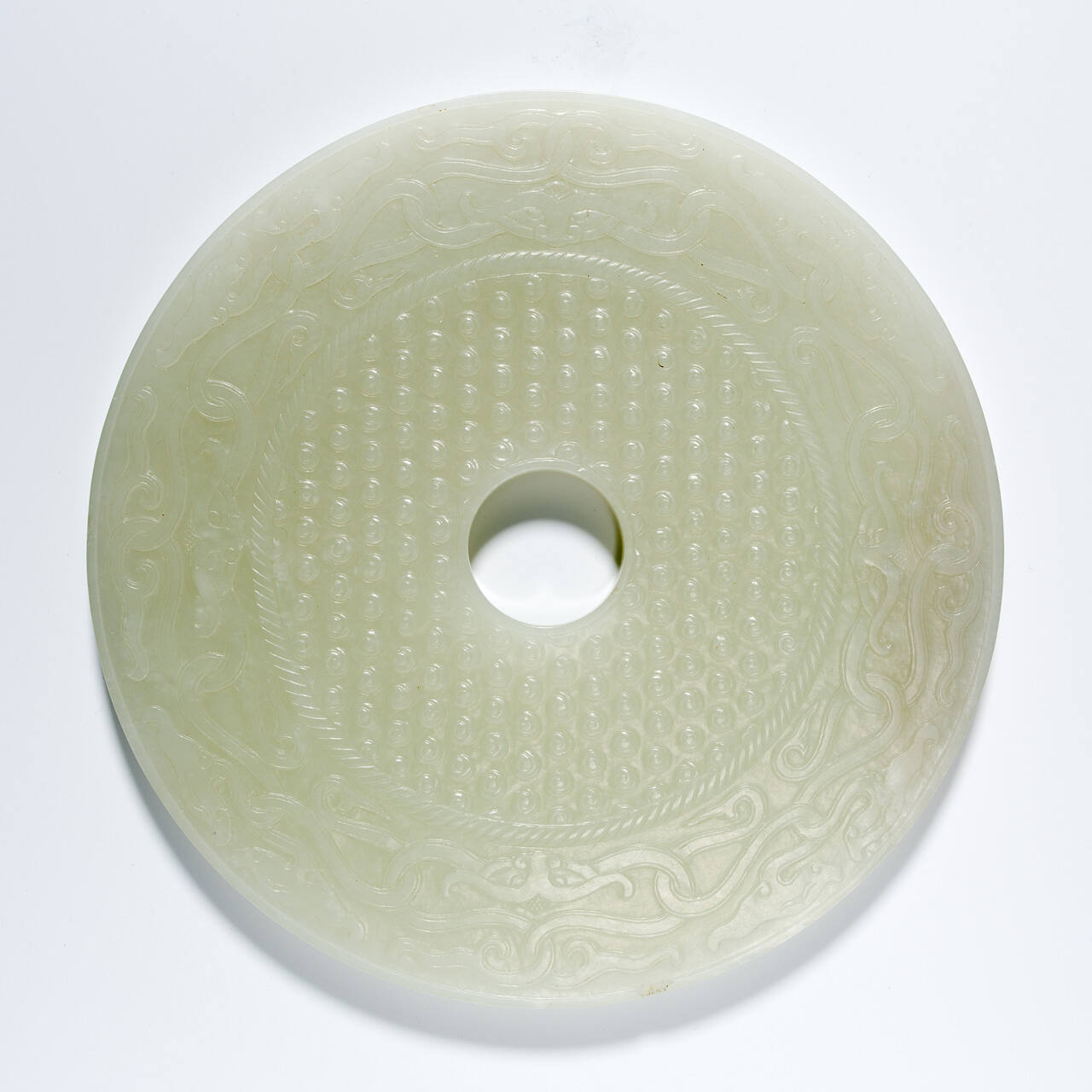 DescriptionIn this disc, the raised design encircling the central opening is interpreted as the rice pattern. The stylized animals which loop together represent kuei dragons, with four rams heads in low relief at the four symbolic directions of the circle. The white nephrite is of even color and translucent. The border encircling the rice pattern is carefully carved in a rope pattern. A narrow, single uncarved border encircles the whole disc.