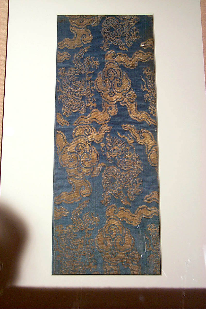 DescriptionBlue satin brocaded in yellow. Design of clouds and dragons.