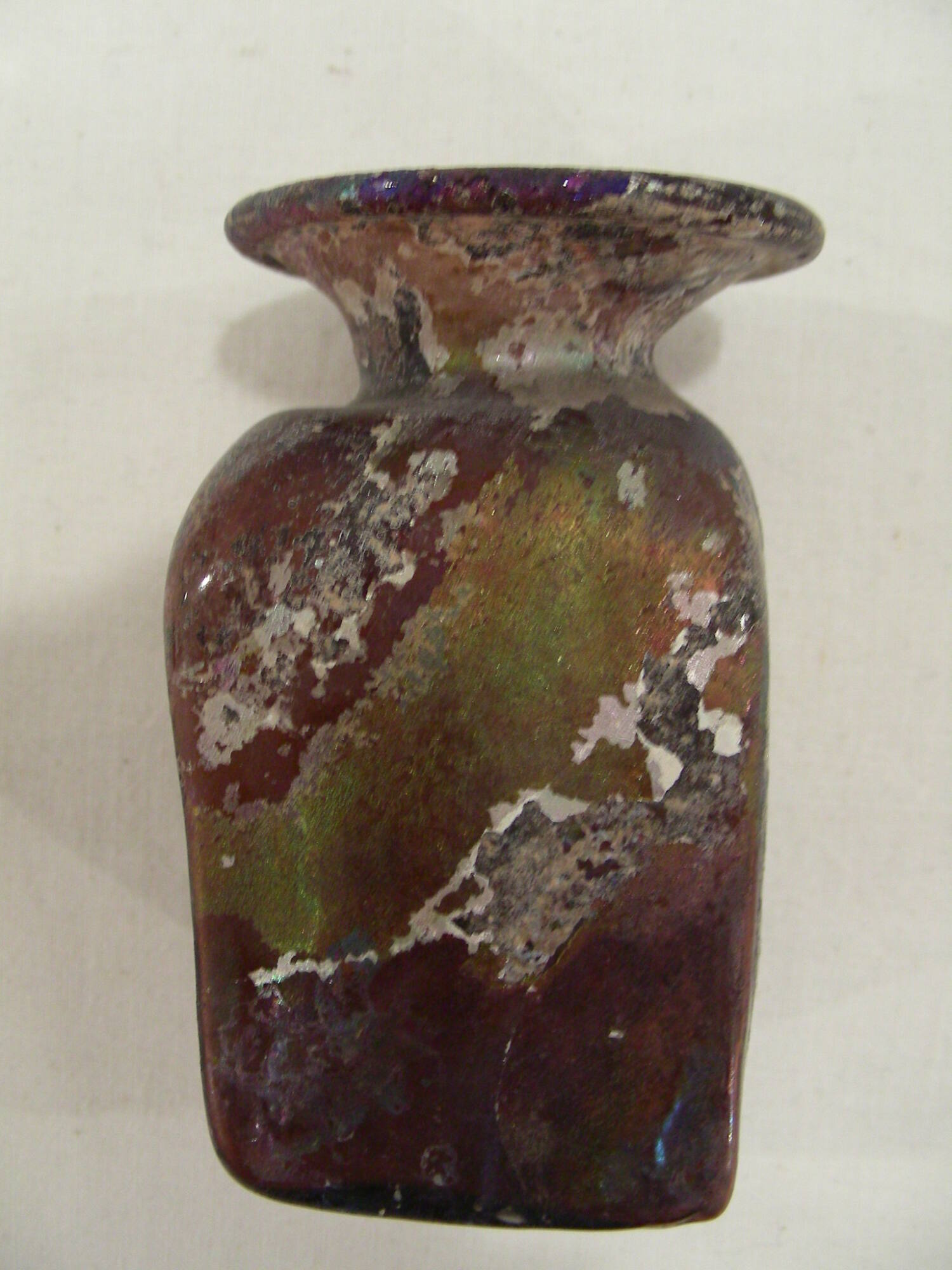 [1] The Nelson-Atkins and the Pacific School of Religion co-sponsored an archaeological expedition at Tell en-Nasbeh, northwest of Jerusalem, in 1932. The expedition was led by Dr. William Frederic Badé. The partage agreement between the institutions specified that if the artistic quality of the found objects was not satisfactory to the Nelson-Atkins, the Pacific School of Religion would transfer objects from its own collection to the Nelson-Atkins to supplement the more recent finds. This object is one of four purple glass pieces transferred from the Pacific School of Religion to the Nelson-Atkins as a result of this agreement. William Frederic Badè wrote in a letter to J. C. Nichols, Nelson-Atkins Trustee, July 1, 1933, NAMA Registration Files: “To this I have added four pieces of purple glass, quite rare, which I secured in a very fortunate manner from a tomb of the 1st or 2nd cent. A.D. at Jebna (Arabic, Yebna)….This purple glass is also one of our previous acquisitions.”