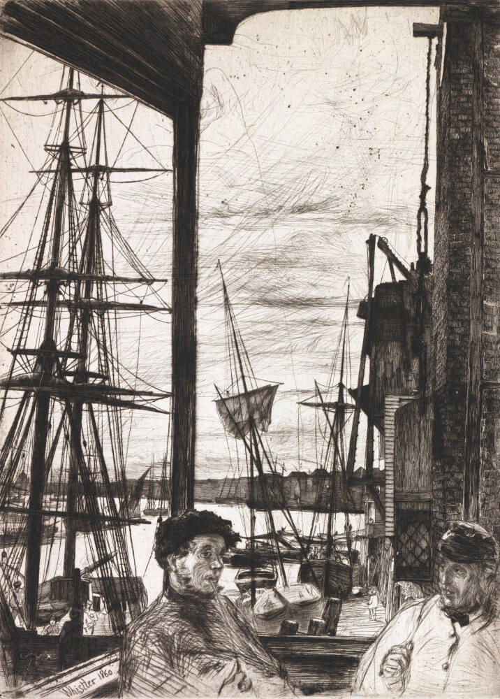 Gallery LabelJames Abbott McNeill Whistler’s views of the river Thames tell interesting stories of 1800s London as a center of shipping and world trade. Perhaps these two men are swapping stories about the sea, while smoking long churchwarden pipes made of clay. The silhouetted masts show this is the end of the day. The evening clouds are suggested by the etching needle’s swift strokes.