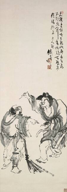 Although Tomioka Tessai is classified as a nanga or literati artist in Japan, the bold, swift brushstrokes he uses to convey the pair’s disheveled and humorous appearances have more in common with Zen traditions. As is common in Zen paintings, structure always exists amidst apparent casualness. Underlying his seemingly random brushwork is a carefully conceived design in which the duo’s playful postures form a rhythmic loop.