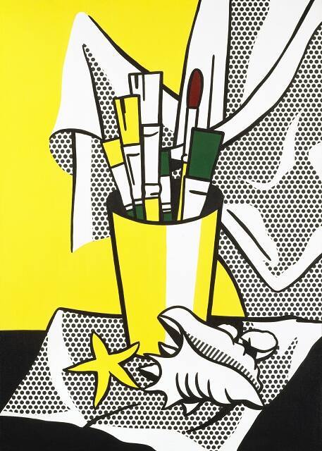 Still Life with Brushes, Shell and Star Fish belongs to a series of paintings by Lichtenstein that investigates the styles and subjects of art history. In this painting, Lichtenstein defies our expectations for the still life by rendering it in the visual language of the comic strip. He reminds us that the process of mechanical reproduction reduces all works of art to simple arrangements of dots.