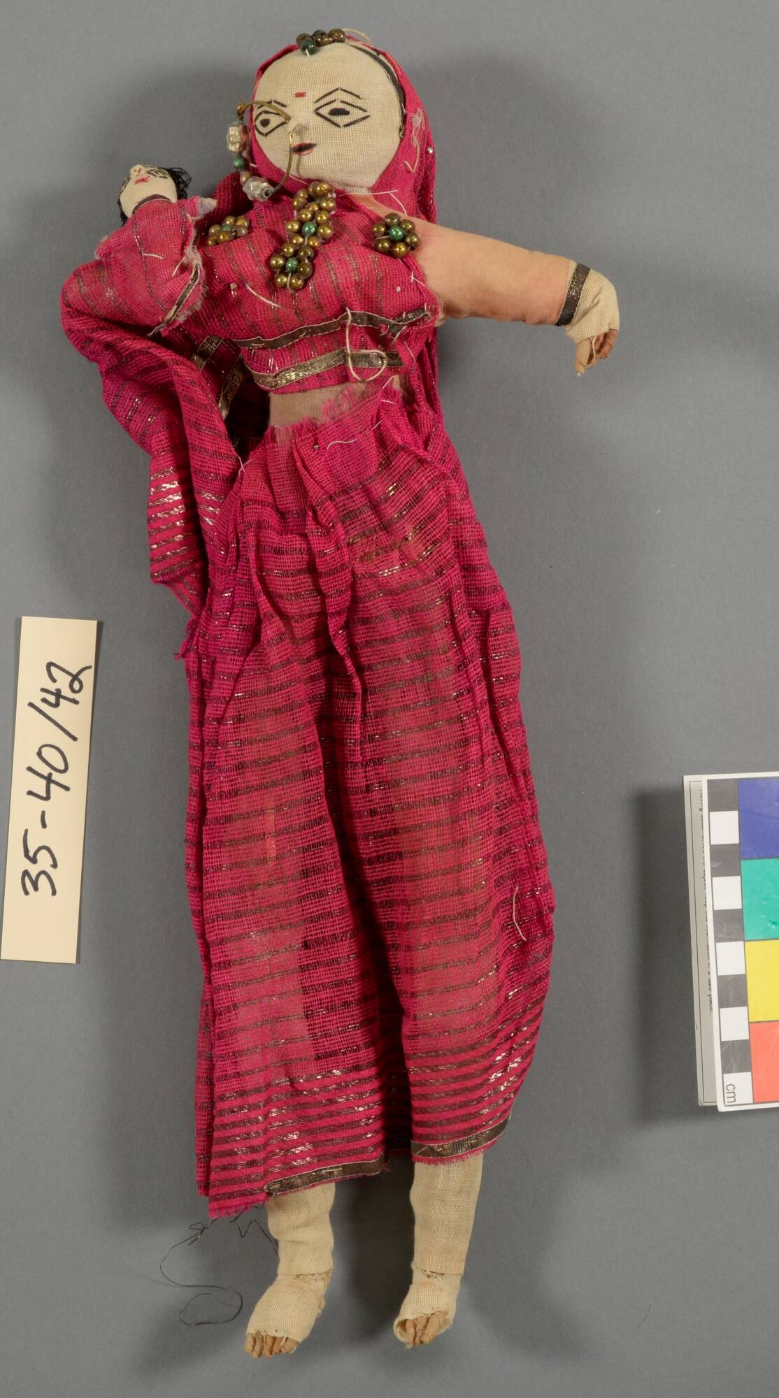 DescriptionMother, wearing cerise dress and sarie, carries child on arm. Wearing nose ring. Made of straw. From Benares.ProvenancePearle Scales Moore (1867-1934), Peoria, IL, by 1934 [1];