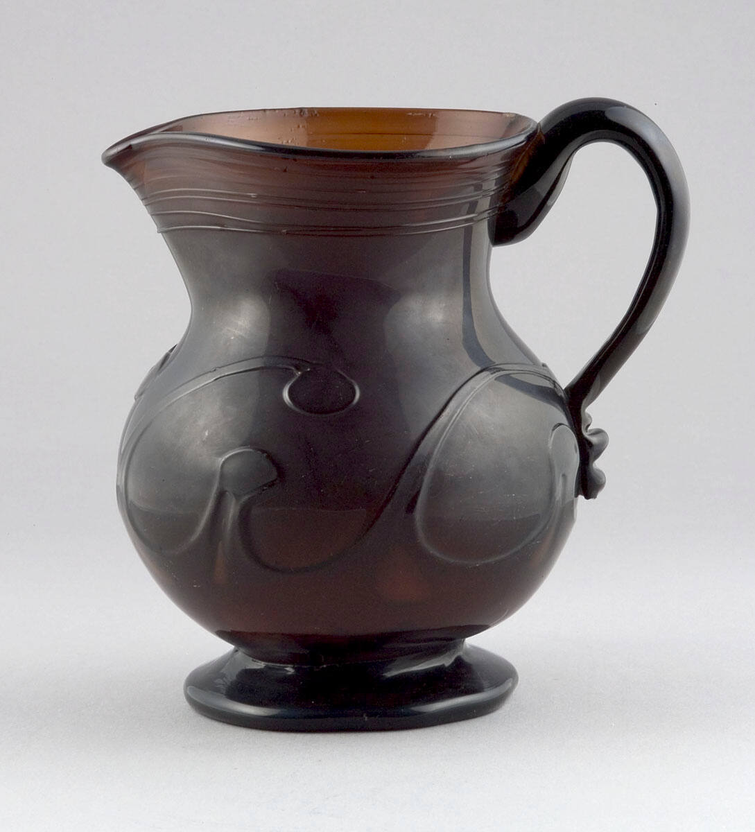 DescriptionDark brown amber, large spherical body, wide short threaded neck with flaring rim and deep lip.