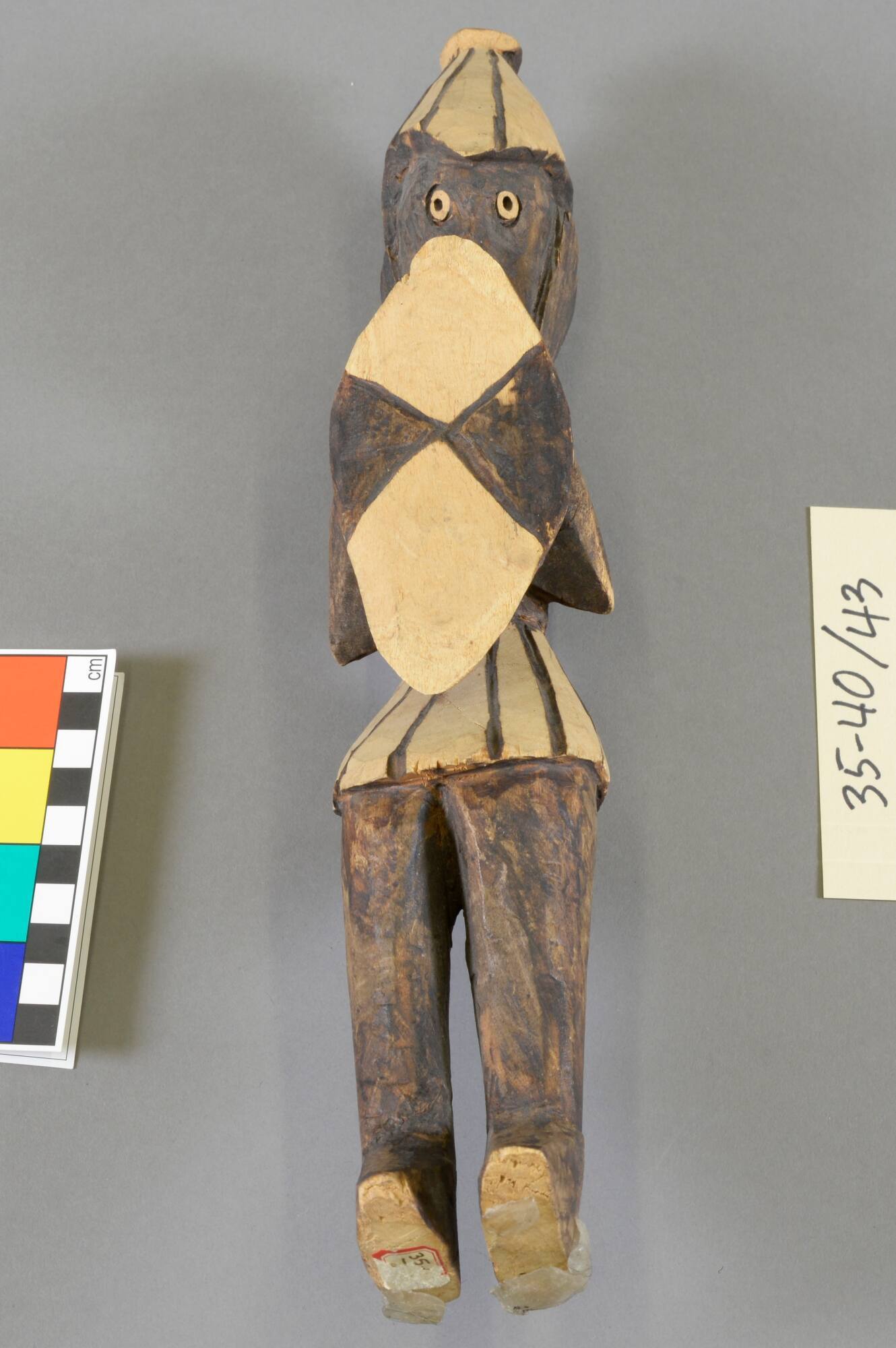 DescriptionCarved wooden figure of warrior, wearing helmet, carrying shield, spear and club. From Durban.ProvenancePearle Scales Moore (1867-1934), Peoria, IL, by 1934 [1];
