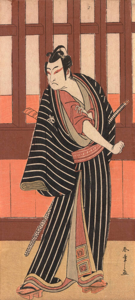 DescriptionThe print depicts an actor from Karigane gonin otoko 雁金五人男 (the Five Men of the Karigane Gang), which is a play produced at the Nakamura Theater during the second month in 1780. The print is in hosoban nishiki-e format.