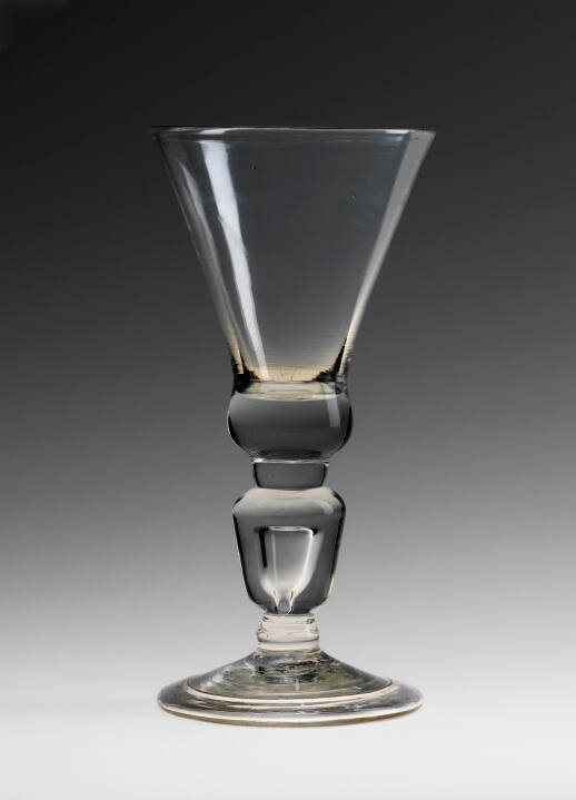 DescriptionFlaring bell bowl with solid bottom over inverted tapering cylinder knop with large teardrop, small basal knop, conical folded foot