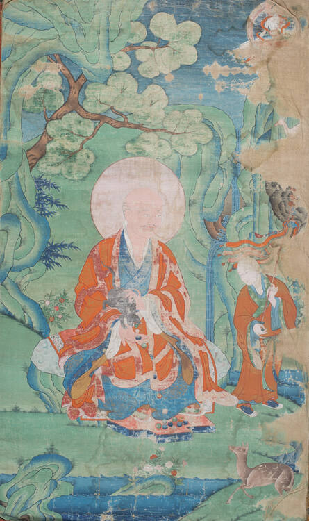 DescriptionA figure in monk's garb, with bare head and halo, holding a mongoose (nakula) spitting jewels. An attendant monk holds a banner.Exhibition HistorySiamese and Tibetan Paintings and Bronzes, Norfolk Society of Arts, VA, November 7–28, 1948, no. 27.