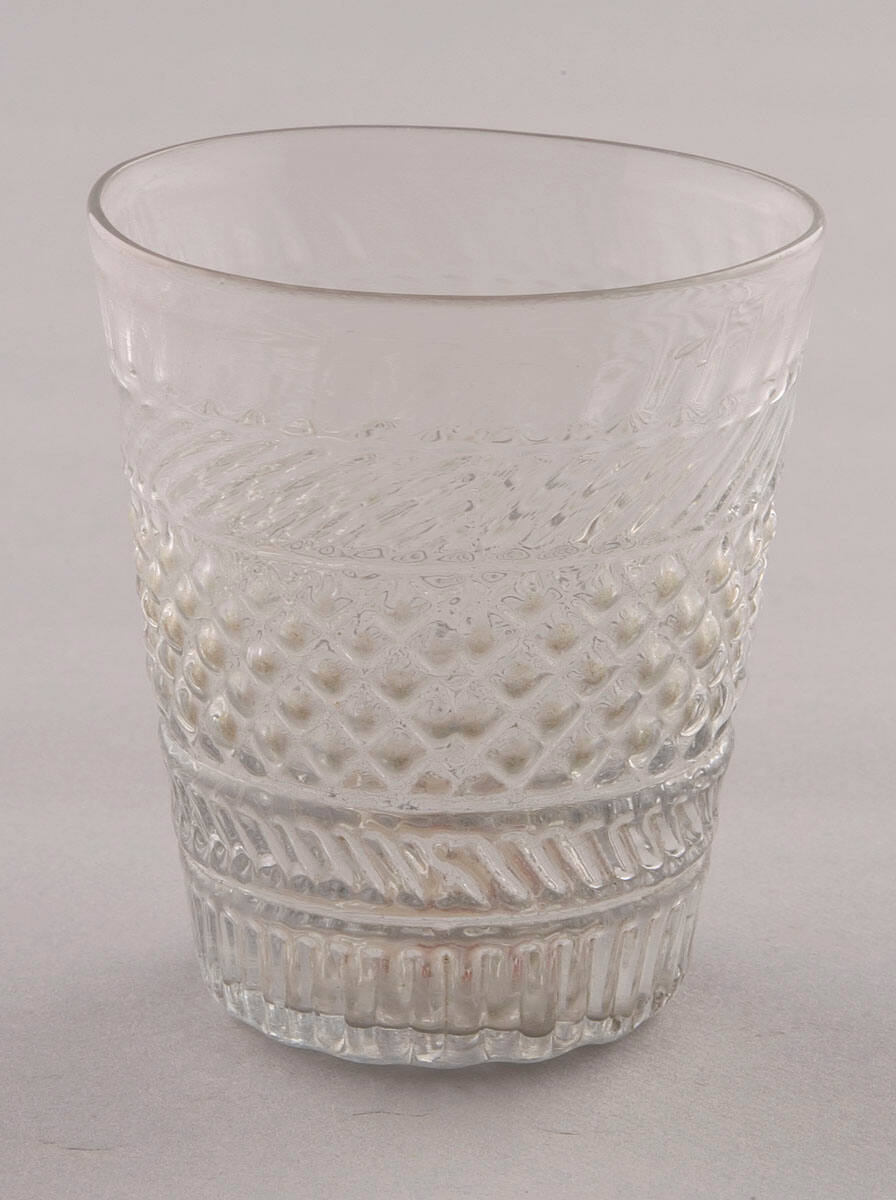 DescriptionClear glass in pattern composed of five bands, circle of small diamond indentations around edge of base.