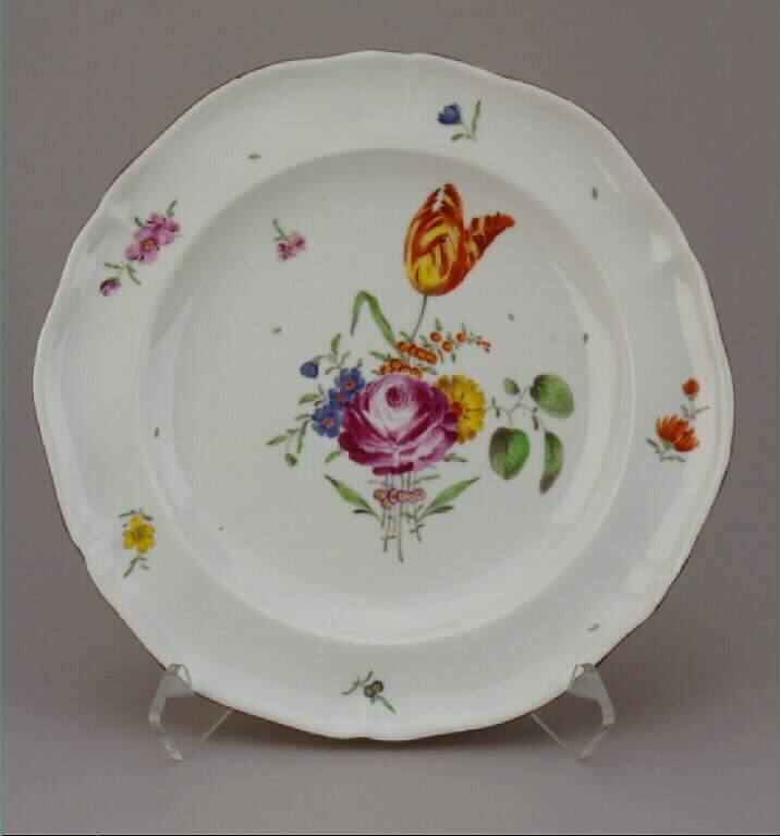 DescriptionPlate with scalloped edge; decorated with large floral spray and small blossoms in polychrome enamels.Published References