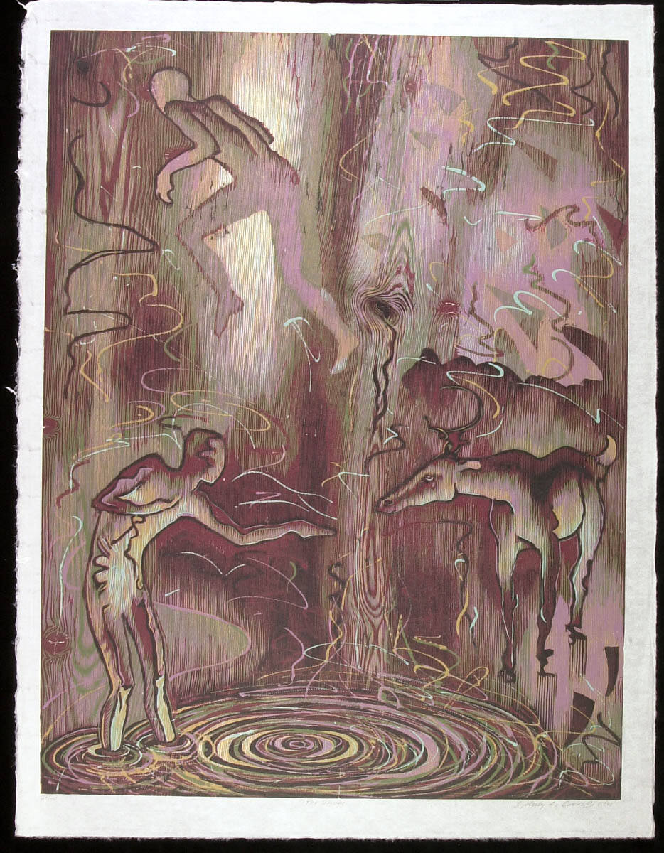 DescriptionA man wades into a pool of water and holds his hand out to a deer. In the upper left corner, a man tip-toes away. The background resembles brightly colored wood grain.Copyright© Sydney Cross