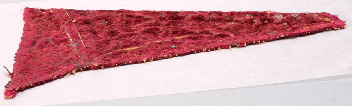 DescriptionAll over design of conventionalized flowers and leaves cut in a red background.