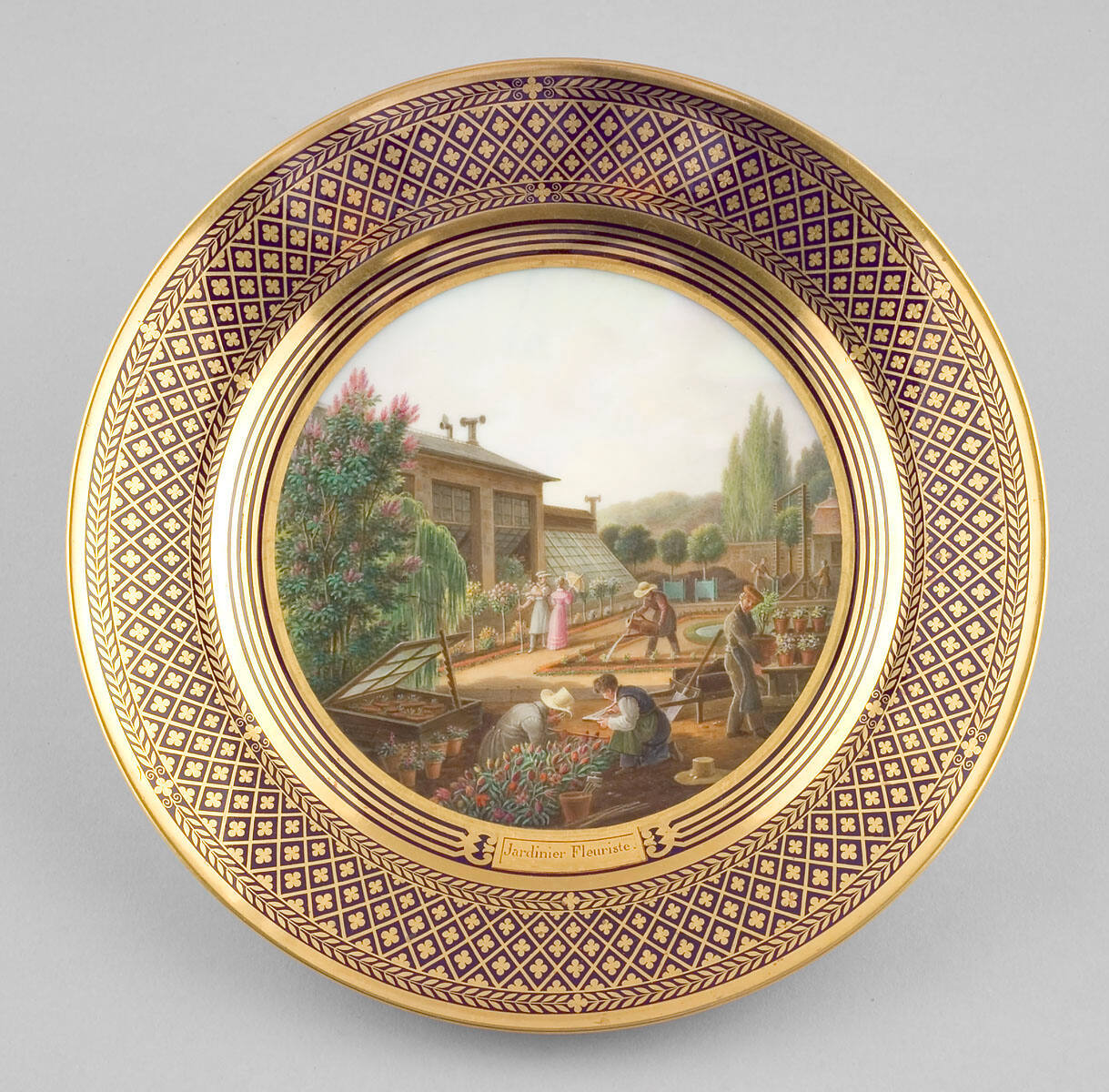 DescriptionThe center painted with a botanist and other figures in a commercial nursery, a cold flat to one side signed and dated by the artist, at the front, above a gilt plaque inscribed Jardinier Fleuriste, the gros bleu rim heightened in gilt bands, florettes, trelliswork, and laurel branches, printed interlaced L's, a fleur-de-lys, Sevres, and the numeral 21 mark in blue, inscribed 30 nov.20.P in green and a further inscription in gold, incised DC 90-8.Exhibition HistoryLuxury and Passion: Inventing French Porcelain, The Nelson-Atkins Museum of Art, Kansas City, Missouri, August 13 2022–August 12 2024, no cat.