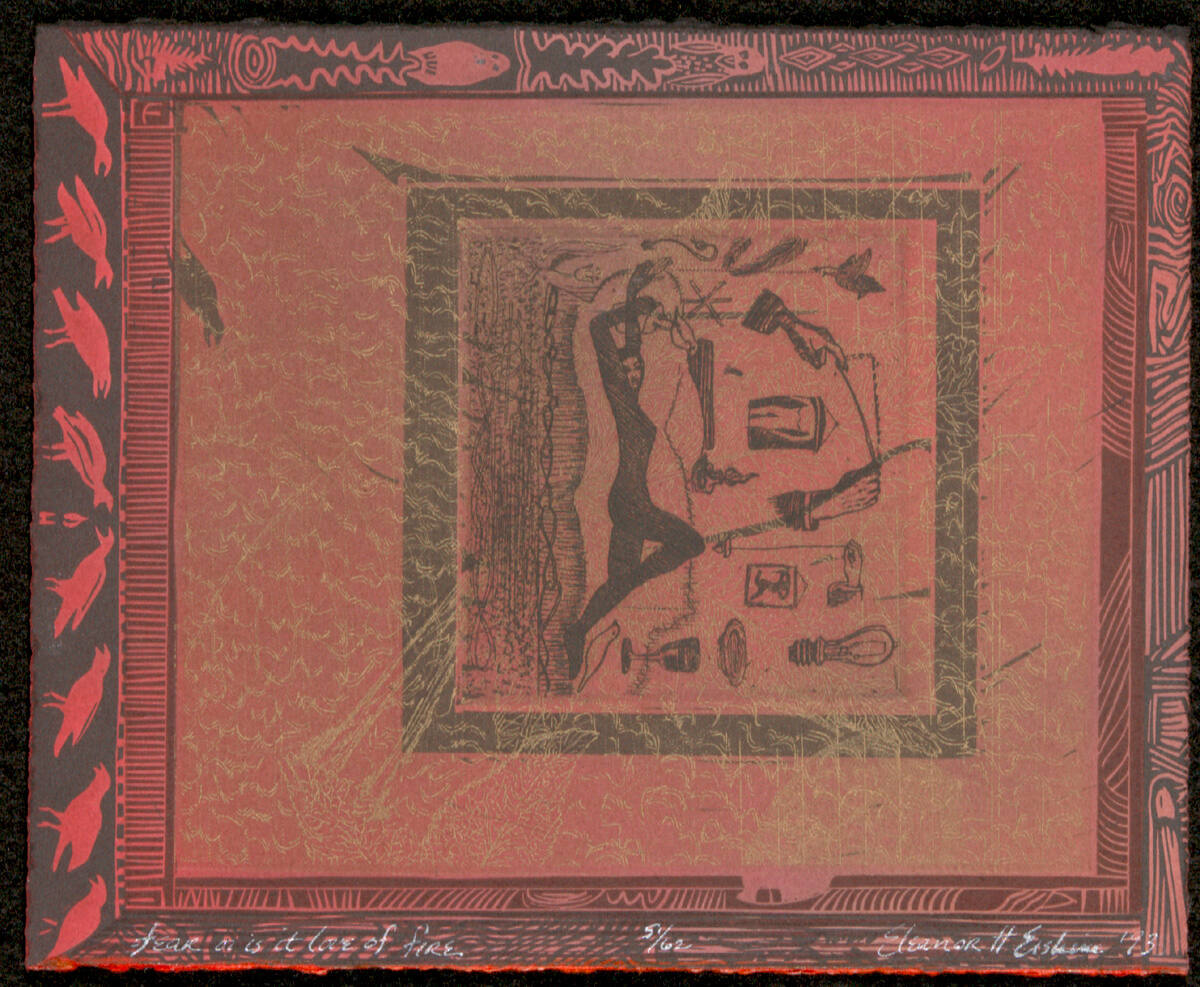 DescriptionFemale figure reclining, hands above head, surrounded by various items floating through space, center, such as (counter clockwise from right) cup, plate, lamp, hands, picture of human torso, birds, rope, tulips, etc. black border surrounds this center portion, with yellow line decoration covering it as well, extending to outer black border on reddish brown paper, where there is no yellow. border covers 3/4 to 1-1/4" all around paper.Copyright© Eleanor H. Erskine