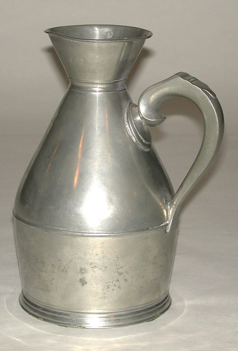 DescriptionRing-like base with several ridges. Lower body in slightly flaring bowl form; upper body an inverted truncated cone. Incised line where base and lower body join. Ridge or reeding between upper and lower portions of body. Wide flaring rim bearing various inspectors marks. Curved handle attached below rim at boss. Touch mark on bottom; "Austen & Son Cork" over rampant lion above crown; below crown, "Imperial". In recess "94 North Main Street." "1Pint" engraved on upper body.