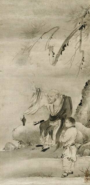 DescriptionYüeh-shan shown seated on a broadly washed rock gesticulating wildly with his right arm and glaring. An attendant stands at his side. A rapidly and loosely brushed pine branch with soft, broadly sketched clusters of needles fills the upper one-third. Shallow stage of space. Li Ao stands in confucian scholar's garb with his hands folded in his sleeves. An attendant stands behind him. Palms rise up the left edge. Palm leaf clusters are distinctively spikey. Drapery is depicted with dense complicated folds from a rapid brush, leading to a fluid, scribbly effect.ProvenanceWith Yabumoto Bijutsuten, Tokyo, by March 24, 1975;