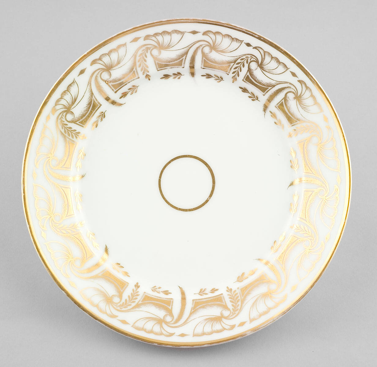 DescriptionRound plate of white porcelain, decorated on the inside with a wide border of gilt in formal design, and continuous leaf pattern. Edge chipped.Provenance