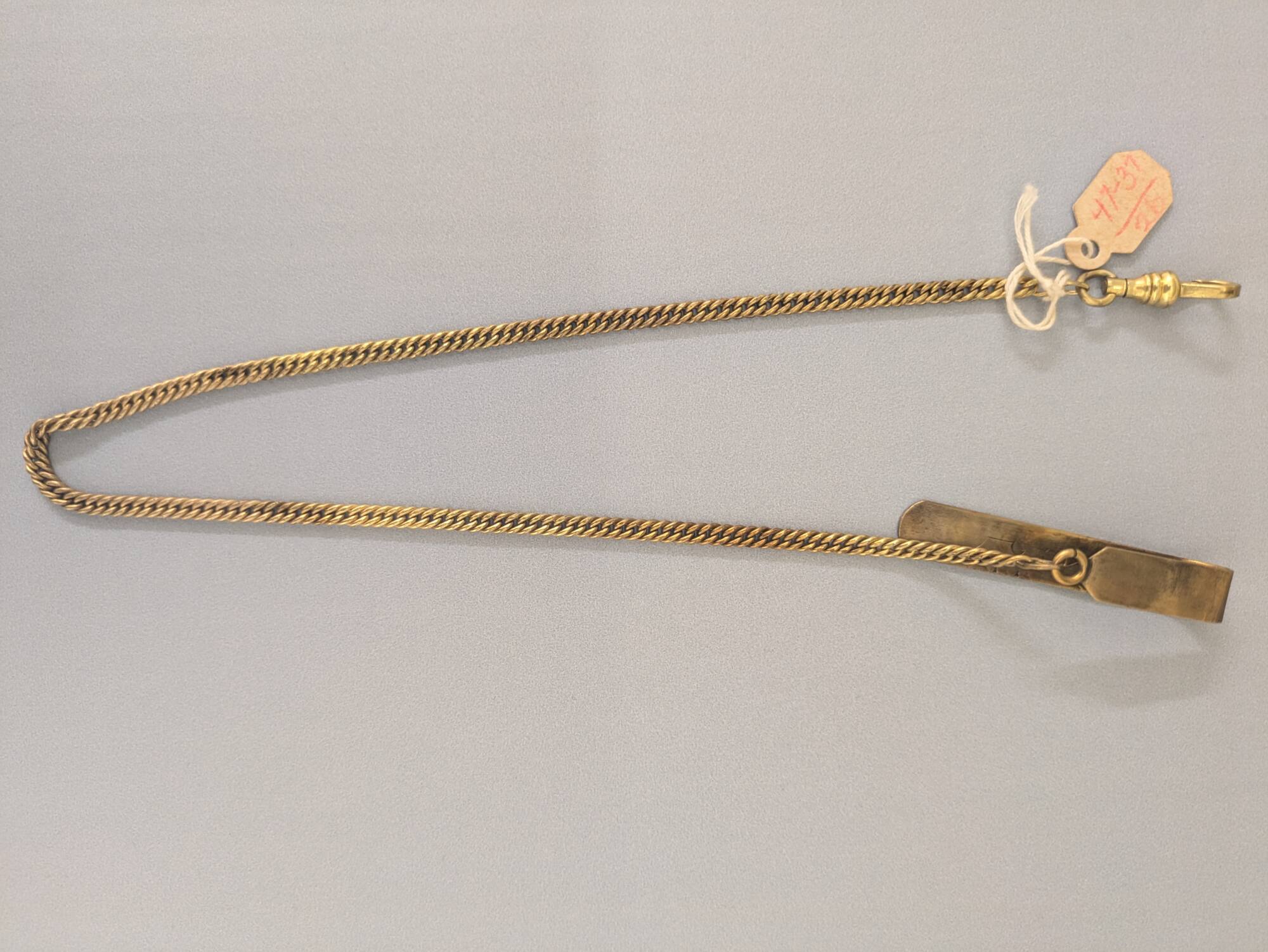 DescriptionGold plated closely woven chain for fan. Hook at end to fasten to waist band of skirt.