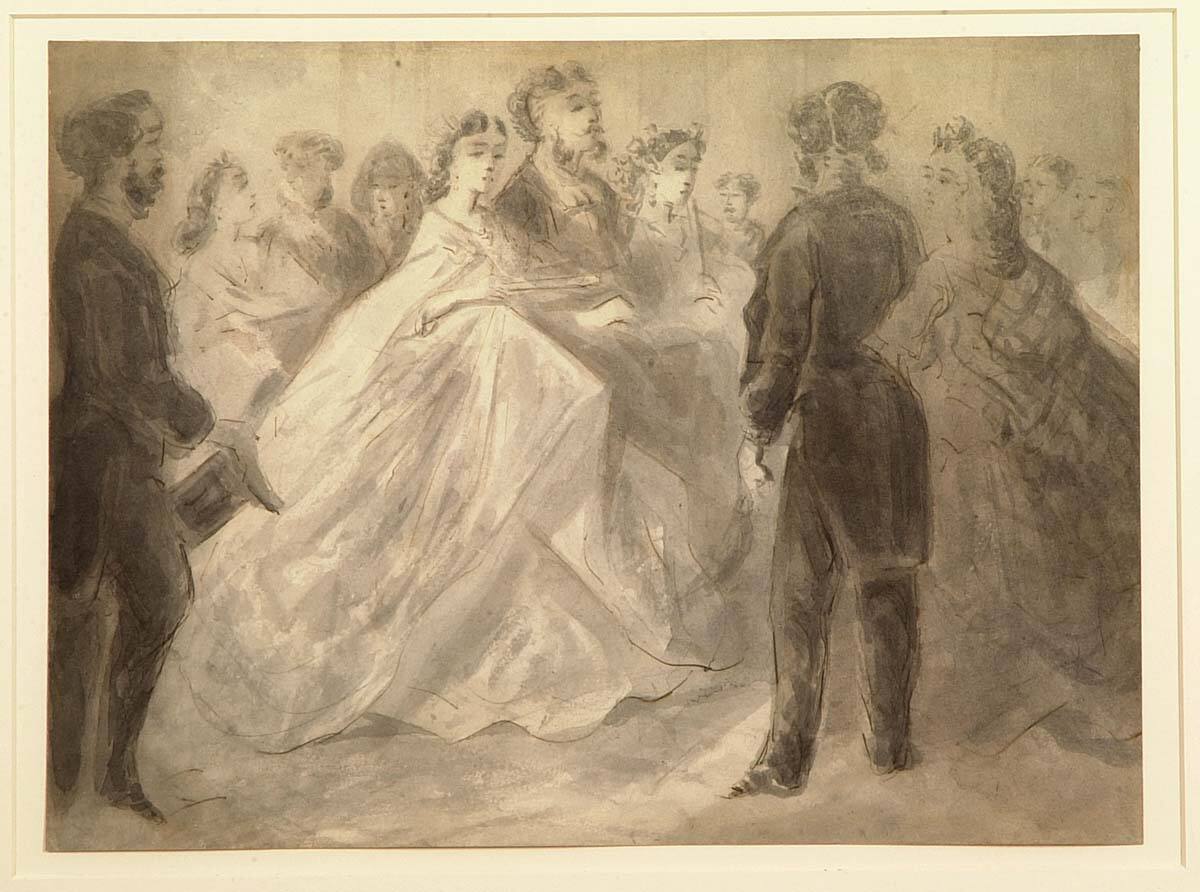 At the Ball belongs to the artist’s numerous sketches drawn from life that capture the customs of the upper middle class, recognizable by their black suits, top hats, ribbons, and crinolines. Guys’s talent was admired by such influential contemporaries as the poet and critic Charles Baudelaire, who declared Guys the ultimate “painter of modern life” in 1863.