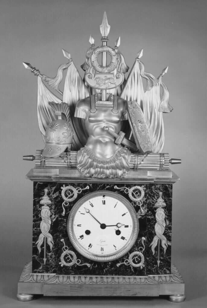 DescriptionMantle clock with gilt bronze banners, breastplate and arms above dialProvenanceWith Rosenberg & Stiebel, New York, stock no. S.230, by November 1981-1982 [1];