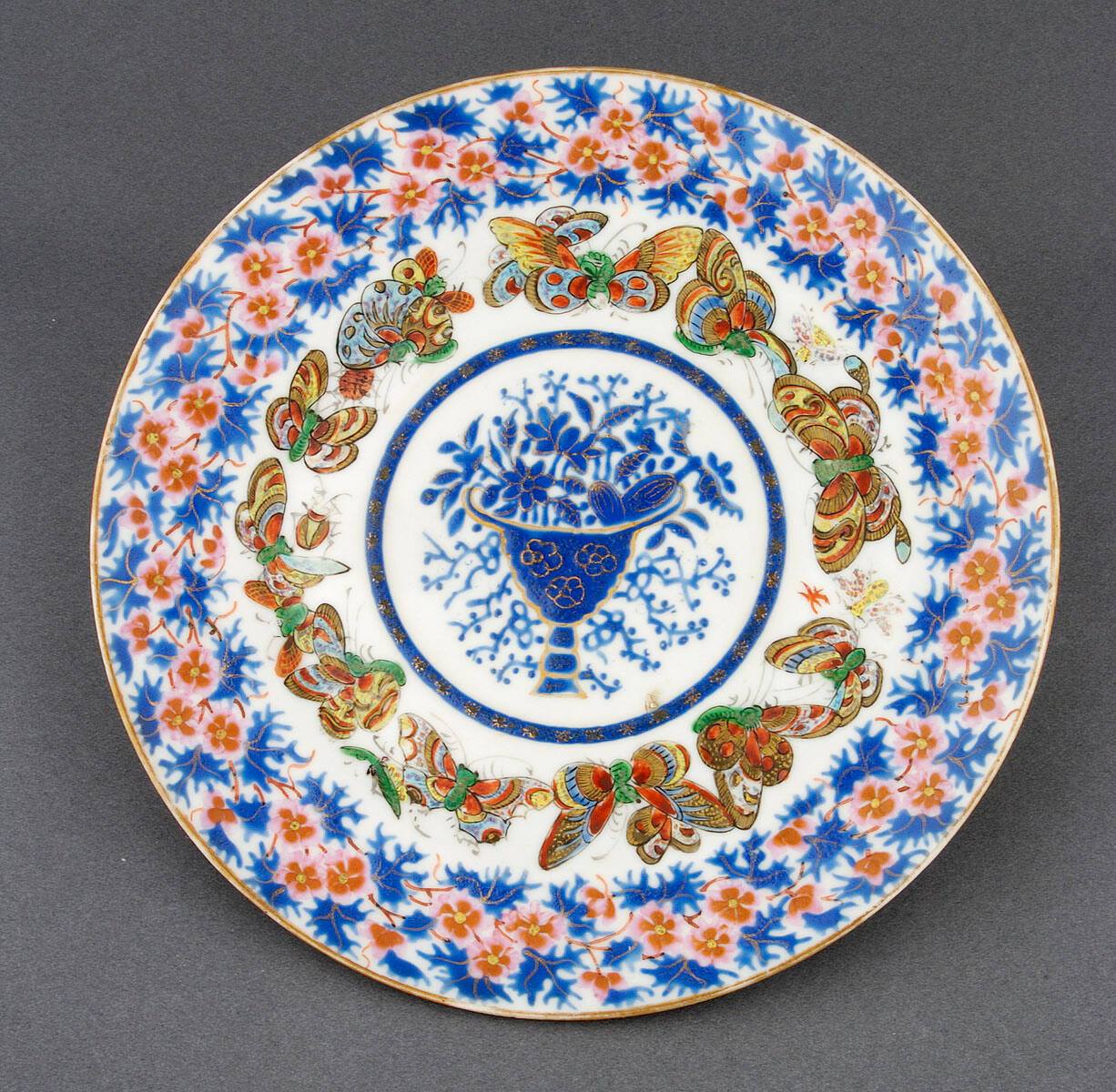 DescriptionSmall, circular plate with enamel-decorated top and plain back. The central image in blue enamel with gold highlighting is of an urn overflowing with flowers and foliage. This inner decoration is surrounded by a thin blue band in enamel with gilded stars; this, in turn, is circled by a wide border of multicolored moths and butterflies in yellow, blue, red, green, and white enamel with gilding. There is a wide outer border of pink and red flowers and blue leaves in enamel and a gilded rim.