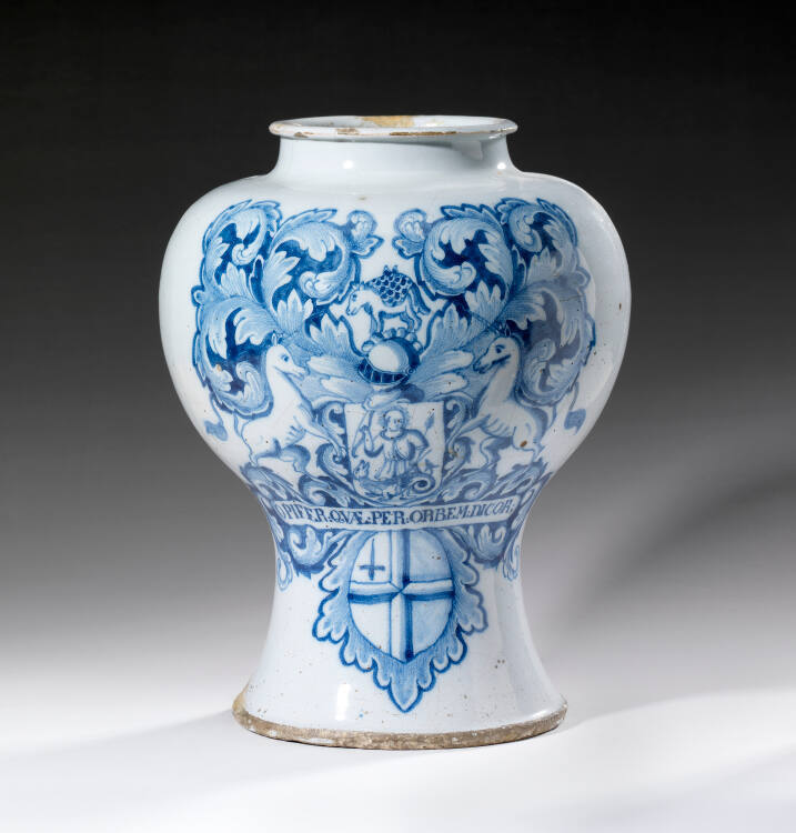 DescriptionMing baluster form painted in blue on white: on the front, bears the arms of the Worshipful Society of Apothecaries, the Society's motto "OPIFER QUAE PER ORBEM", and the arms of the City of London.Gallery LabelMade for the Worshipful Society of Apothecaries, these ceramic objects served commercial purposes. While functional pill slabs were used for rolling out a pharmaceutical mixture into pills, this slab's lack of wear and degree of decoration indicate that it was most likely hung as a decorative shop sign. Both pieces display the apothecary's armorial featuring Apollo, the Greek god of healing, triumphantly defeating the dragon of disease and the apothecary's motto: "Opiferque per orbem dicor" (The art of medicine is my discovery). The pair of unicorns and the rhinoceros in between allude to the animals' horns' healing powers.