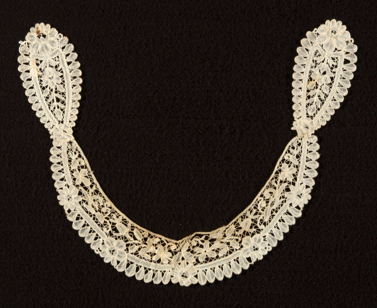 DescriptionBobbin-made part lace of the type known as Duchesse. Fairly coarse lace worked in whole and half stitch with raised edges worked with thick thread, bundles of thread, and some "woven." The tie is made to fit around a shallow V-shaped neck and for the two ends to cross at the center front forming a stylized bow.