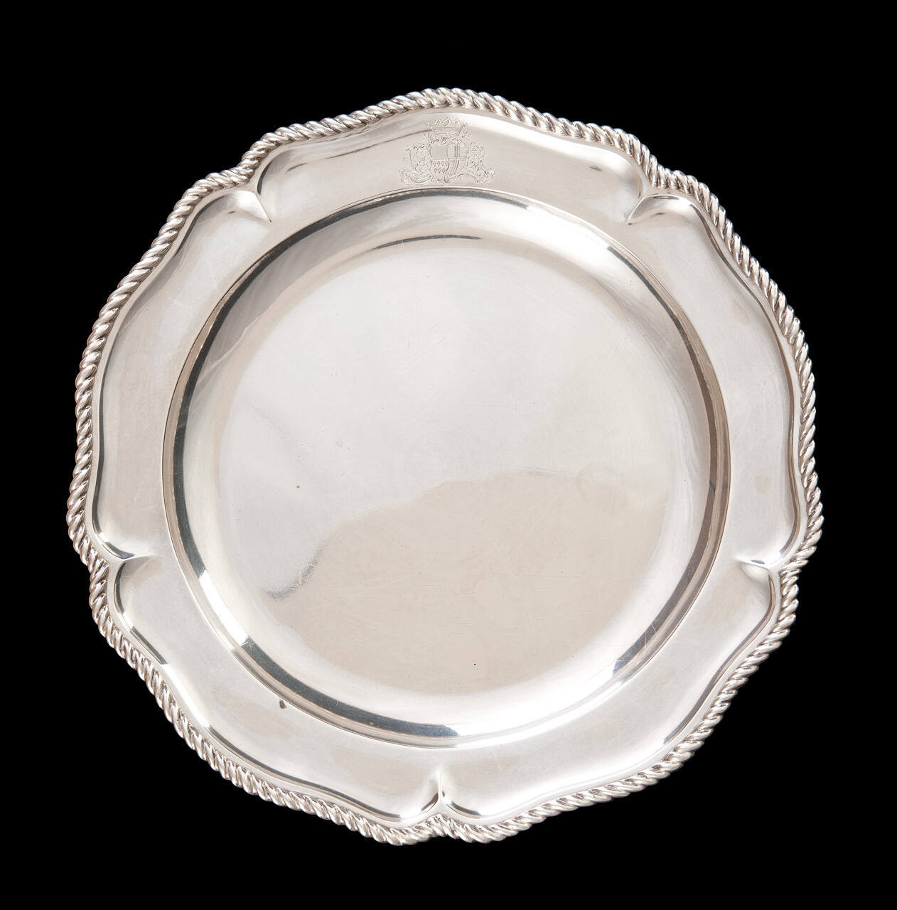DescriptionShallow plate with flat edge, scalloped gadroon border, crest engraved at top edge.