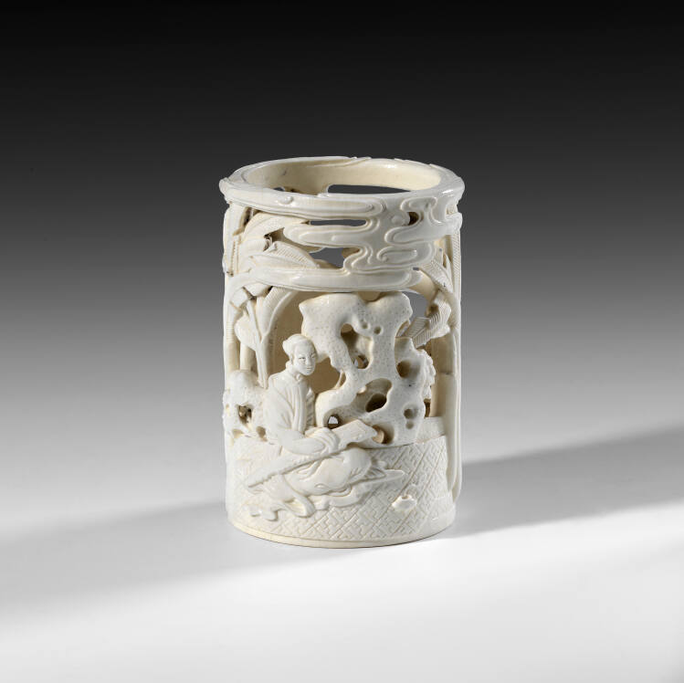 DescriptionSoft-paste, porcelain "Pi Tung" brush holder. Carved in high relief around the holder is a woman playing a guqin (Chinese zither) in a palm garden. With a teakwood stand.ProvenanceYamanaka & Co.;