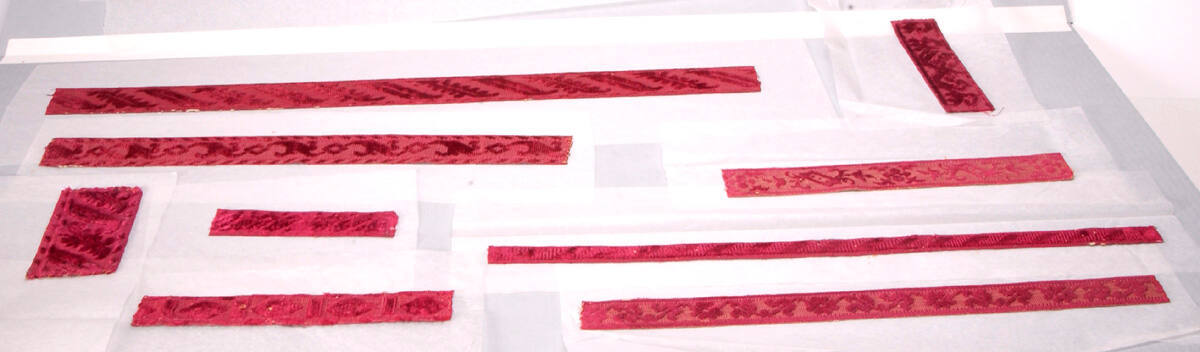 DescriptionBorders of continuous abstract designs cut in red velvet.